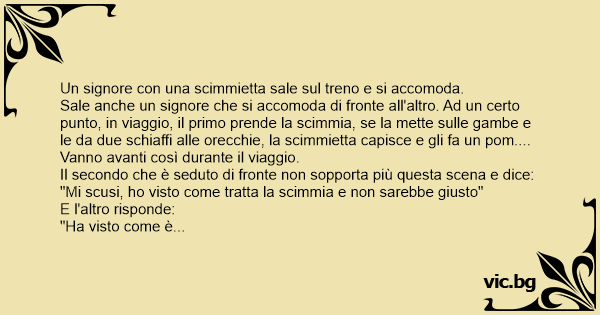 Sale anche un signore che si accomoda di fronte all'altro. Ad un certo punto, in viaggio, il primo prende la scimmia, se la mette sulle gambe e le da due schiaffi alle orecchie, la scimmietta capisce e gli fa un pom....