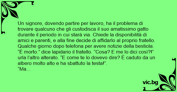 Un signore, dovendo partire per lavoro, ha il problema di trovare qualcuno che gli custodisca il suo amatissimo gatto durante il periodo in cui starà via. Chiede la disponibilità di amici e parenti, e alla fine decide di affidarlo al proprio fratello. Qualche giorno dopo telefona per avere notizie della bestiola. “È morto.” dice lapidario il fratello. “Cosa? E me lo dici così?!” urla l’altro alterato. “E come te lo dovevo dire? È caduto da un albero molto alto e ha sbattuto la testa!”.