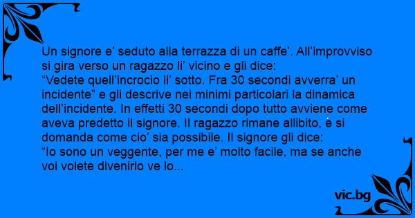 “Vedete quell’incrocio li’ sotto. Fra 30 secondi avverra’ un incidente” e gli descrive nei minimi particolari la dinamica dell’incidente. In effetti 30 secondi dopo tutto avviene come aveva predetto il signore. Il ragazzo rimane allibito, e si domanda come cio’ sia possibile. Il signore gli dice: