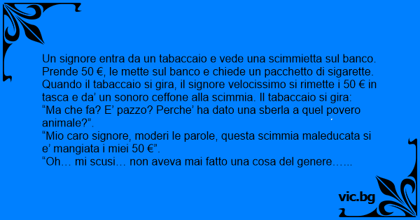 Un signore entra da un tabaccaio e vede una scimmietta sul banco. Prende 50 €, le mette sul banco e chiede un pacchetto di sigarette. Quando il tabaccaio si gira, il signore velocissimo si rimette i 50 € in tasca e da’ un sonoro ceffone alla scimmia. Il tabaccaio si gira: