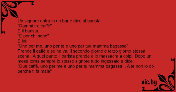 Prende il caffè e se ne va. Il secondo giorno e terzo giorno stessa scena.. A quel punto il barista prende e lo massacra a colpi. Dopo un mese torna sempre lo stesso signore tutto ingessato e dice: