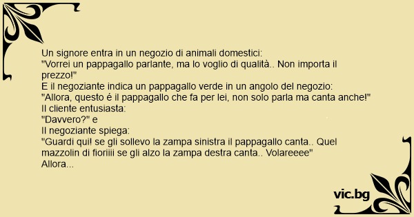 "Allora, questo é il pappagallo che fa per lei, non solo parla ma canta anche!"