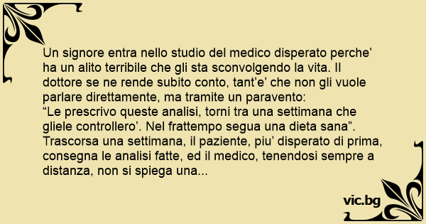 “Le prescrivo queste analisi, torni tra una settimana che gliele controllero’. Nel frattempo segua una dieta sana”. Trascorsa una settimana, il paziente, piu’ disperato di prima, consegna le analisi fatte, ed il medico, tenendosi sempre a distanza, non si spiega una simile alitosi. “Abbia pazienza ancora una settimana” – dice il medico – “la terro’ in osservazione presso la mia clinica”. La settimana successiva il medico convoca il paziente e, tenendosi sempre ben lontano, gli dice:
