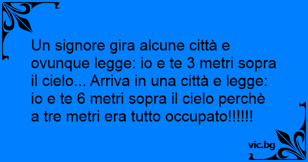 Un signore gira alcune città e ovunque legge: io e te 3 metri sopra il cielo... Arriva in una città e legge: io e te 6 metri sopra il cielo perchè a tre metri era tutto occupato!!!!!!