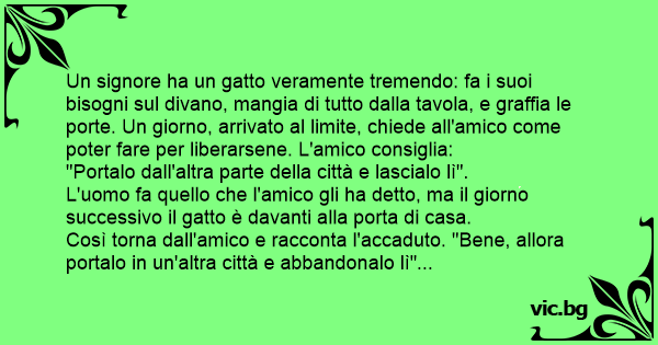 Un signore ha un gatto veramente tremendo: fa i suoi bisogni sul divano, mangia di tutto dalla tavola, e graffia le porte. Un giorno, arrivato al limite, chiede all'amico come poter fare per liberarsene. L'amico consiglia:
