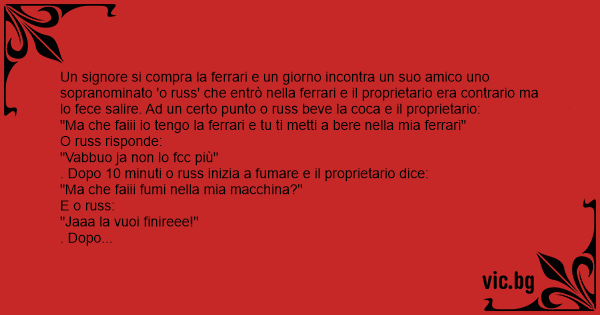 Un signore si compra la ferrari e un giorno incontra un suo amico uno sopranominato 'o russ' che entrò nella ferrari e il proprietario era contrario ma lo fece salire. Ad un certo punto o russ beve la coca e il proprietario: