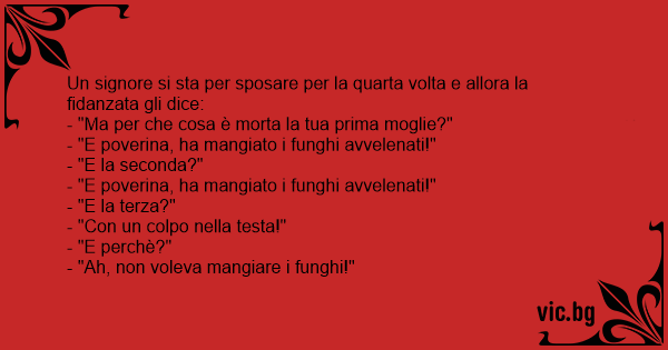 - Hur dog din första man! - Han åt giftig svamp. - Hur dog din andra man? - Han åt giftig svamp. - Hur dog din tredje man? - Honom slog jag ihjäl - Varför det? - Han vägrade äta min...