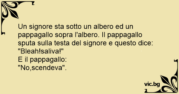 Un signore sta sotto un albero ed un pappagallo sopra l'albero. Il pappagallo sputa sulla testa del signore e questo dice: