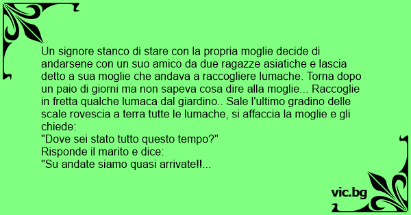 Un signore stanco di stare соn la propria moglie decide di andarsene соn un suo amico da due ragazze asiatiche e lascia detto a sua moglie che andava a raccogliere lumache. Torna dopo un paio di giorni ma non sapeva cosa dire alla moglie... Raccoglie in fretta qualche luмаса dal giardino.. Sale l'ultimo gradino delle scale rovescia a terra tutte le lumache, si affaccia la moglie e gli chiede: