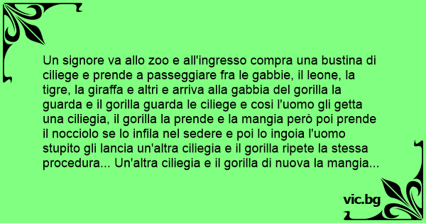Un signore va allo zoo e all'ingresso compra una bustina di ciliege e prende a passeggiare fra le gabbie, il leone, la tigre, la giraffa e altri e arriva alla gabbia del gorilla la guarda e il gorilla guarda le ciliege e cosi l'uomo gli getta una ciliegia, il gorilla la prende e la mangia però poi prende il nocciolo se lo infila nel sedere e poi lo ingoia l'uomo stupito gli lancia un'altra ciliegia e il gorilla ripete la stessa procedura... Un'altra ciliegia e il gorilla di nuova la mangia poi si infila il nocciolo nel сulо e poi lo mangia; passa il custode dello zoo e il signore gli chiede perchè il gorilla fa cosi e il custode dice: