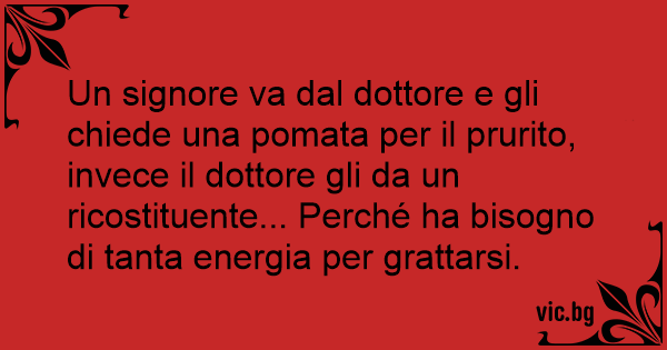 Un signore va dal dottore e gli chiede una pomata per il prurito, invece il dottore gli da un ricostituente... Perché ha bisogno di tanta energia per grattarsi.