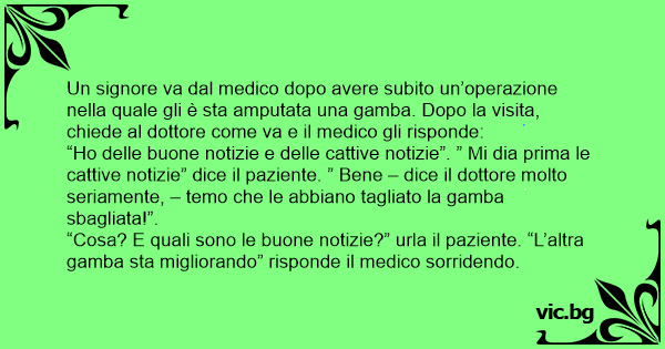 “Но delle buone notizie e delle cattive notizie”. ” Mi dia prima le cattive notizie” dice il paziente. ” Bene – dice il dottore molto seriamente, – temo che le abbiano tagliato la gamba sbagliata!”.
