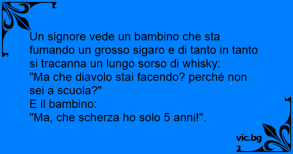 Un signore vede un bambino che sta fumando un grosso sigaro e di tanto in tanto si tracanna un lungo sorso di whisky: