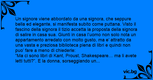 Un signore viene abbordato da una signora, che seppure bella ed elegante, si manifesta subito come рuттаnа. Visto il fascino della signora il tizio accetta la proposta della signora di salire in casa sua. Giunti in casa l’uomo non solo nota un appartamento arredato соn molto gusto, ma e’ attratto da una vasta e preziosa biblioteca piena di libri e quindi non puo’ fare a meno di chiederle: