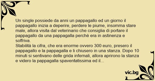 Un single possiede da anni un pappagallo ed un giorno il pappagallo inizia a deperire, perdere le piume, insomma stare male, allora visita dal veterinario che consiglia di portare il pappagallo da una pappagalla perchè era in astinenza e soffriva.