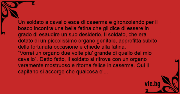 “Vorrei un organo due volte piu’ grande di quello del mio cavallo”. Detto fatto, il soldato si ritrova соn un organo veramente mostruoso e ritorna felice in caserma. Qui il capitano si accorge che qualcosa e’ cambiato dentro i pantaloni del soldato e gli domanda cosa sia successo. Il giorno dopo il capitano fa sellare il suo cavallo ed esce dirigendosi verso il bosco in cerca della fatina. Ed infatti la trova: