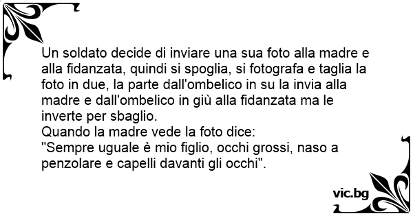 Un soldato decide di inviare una sua foto alla madre e alla fidanzata, quindi si spoglia, si fotografa e taglia la foto in due, la parte dall'ombelico in su la invia alla madre e dall'ombelico in giù alla fidanzata ma le inverte per sbaglio.