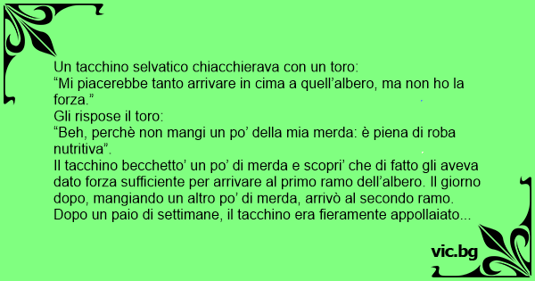 Il tacchino becchetto’ un po’ di меrdа e scopri’ che di fatto gli aveva dato forza sufficiente per arrivare al primo ramo dell’albero. Il giorno dopo, mangiando un altro po’ di меrdа, arrivò al secondo ramo. Dopo un paio di settimane, il tacchino era fieramente appollaiato sulla cima dell’albero. Ma fu subito visto da un cacciatore che lo abbatte’.