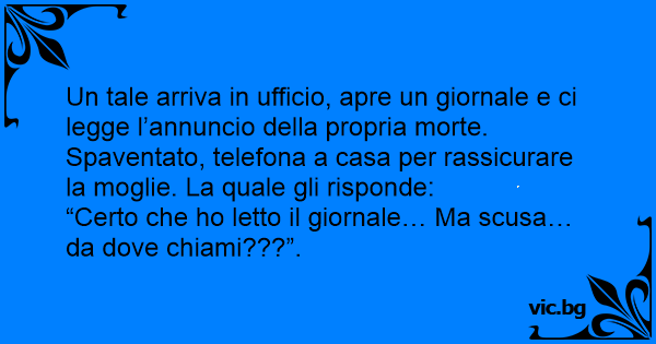 Un tale arriva in ufficio, apre un giornale e ci legge l’annuncio della propria morte. Spaventato, telefona a casa per rassicurare la moglie. La quale gli risponde: