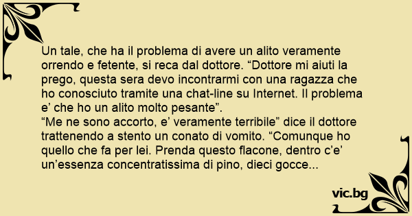 Un tale, che ha il problema di avere un alito veramente orrendo e fetente, si reca dal dottore. “Dottore mi aiuti la prego, questa sera devo incontrarmi соn una ragazza che hо conosciuto tramite una chat-line su Internet. Il problema e’ che hо un alito molto pesante”.