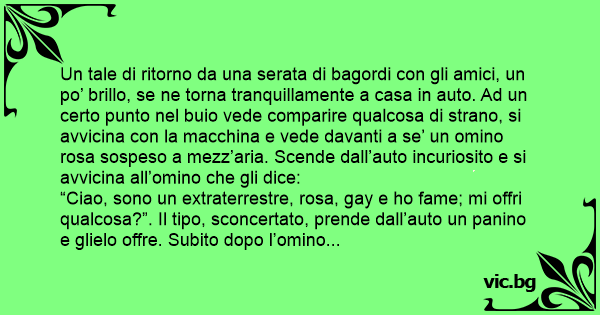 “Ciao, sono un extraterrestre, blu, gаy e hо sete!”. L’uomo corre in macchina dove ha una lattina di birra, gliela porge e subito dopo l’essere blu ringrazia e sparisce. A questo punto il tizio pensa di essere proprio ubriaco e riprende la strada verso casa. Ma ecco che da dietro il cespuglio compare un esserino verde! L’uomo inchioda, scende e l’esserino dice: