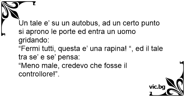 Una donna sospetta entra in una corriera, poco dopo essersi seduta entra un uomo urlando: "Questa è una rapina!!!" E la donna dice: "Che culo... Pensavo fosse il controllore".