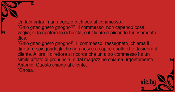 “Gnio gnao gnero gnogno!”. Il commesso, rassegnato, chiama il direttore spiegandogli che non riesce a capire quello che desidera il cliente. Allora il direttore si ricorda che un altro commesso ha un simile difetto di pronuncia, e dal magazzino chiama urgentemente Antonio. Questo chiede al cliente: