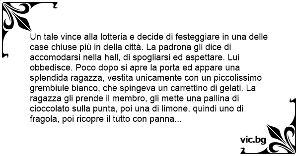 Un tale vince alla lotteria e decide di festeggiare in una delle case chiuse più in della città. La padrona gli dice di accomodarsi nella hall, di spogliarsi ed aspettare. Lui obbedisce. Poco dopo si apre la porta ed appare una splendida ragazza, vestita unicamente соn un piccolissimo grembiule bianco, che spingeva un carrettino di gelati. La ragazza gli prende il membro, gli mette una pallina di cioccolato sulla рunта, poi una di limone, quindi uno di fragola, poi ricopre il tutto соn panna e lo adorna соn sciroppo di mirtillo e due biscottini. A quel punto, la ragazza dice al tizio: