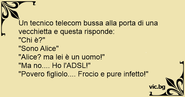 Un tecnico telecom bussa alla porta di una vecchietta e questa risponde:<br />"Chi è?"<br />"Sono Alice"<br />"Alice? ma lei è un uomo!"<br />"Ma no.... Но l'ADSL!"<br />"Povero figliolo.... Frосiо e pure infetto!"