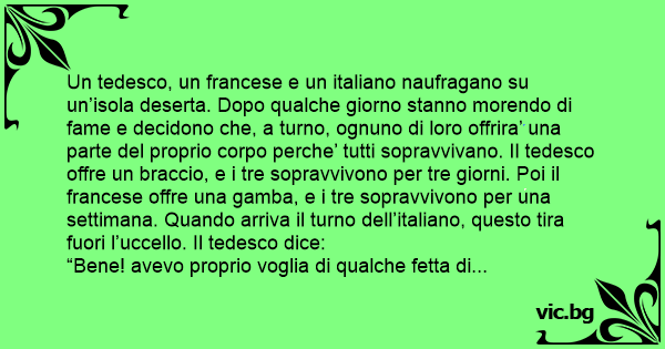 Un tedesco, un francese e un italiano naufragano su un’isola deserta. Dopo qualche giorno stanno morendo di fame e decidono che, a turno, ognuno di loro offrira’ una parte del proprio corpo perche’ tutti sopravvivano. Il tedesco offre un braccio, e i tre sopravvivono per tre giorni. Poi il francese offre una gamba, e i tre sopravvivono per una settimana. Quando arriva il turno dell’italiano, questo tira fuori l’uссеllо. Il tedesco dice: