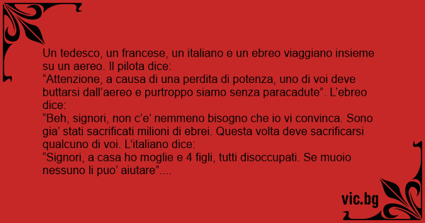“Attenzione, a causa di una perdita di potenza, uno di voi deve buttarsi dall’aereo e purtroppo siamo senza paracadute”. L’ebreo dice: