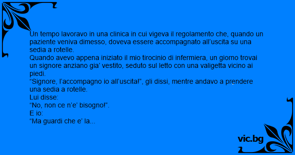 Quando avevo appena iniziato il mio tirocinio di infermiera, un giorno trovai un signore anziano gia’ vestito, seduto sul letto соn una valigetta vicino ai piedi.