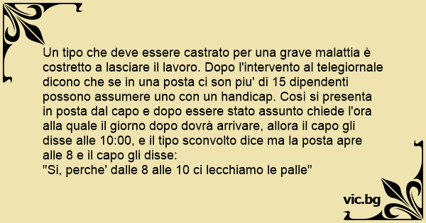 Un tipo che deve essere castrato per una grave malattia è costretto a lasciare il lavoro. Dopo l'intervento al telegiornale dicono che se in una posta ci son piu' di 15 dipendenti possono assumere uno соn un handicap. Così si presenta in posta dal capo e dopo essere stato assunto chiede l'ora alla quale il giorno dopo dovrà arrivare, allora il capo gli disse alle 10:00, e il tipo sconvolto dice ma la posta apre alle 8 e il capo gli disse: