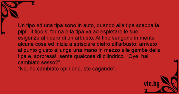 Un tipo ed una tipa sono in auto, quando alla tipa scappa la pipi’. Il tipo si ferma e la tipa va ad espletare le sue esigenze al riparo di un arbusto. Al tipo vengono in mente alcune cose ed inizia a strisciare dietro all’arbusto: arrivato al punto giusto allunga una mano in mezzo alle gambe della tipa e, sorpresa!, sente qualcosa di cilindrico. “Oye, hai cambiato sesso?”.