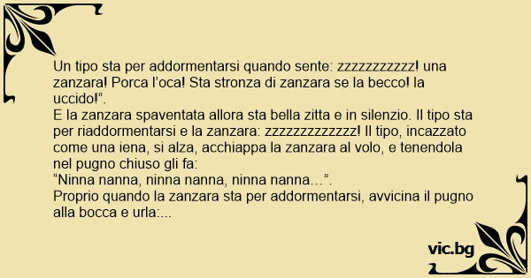 E la zanzara spaventata allora sta bella zitta e in silenzio. Il tipo sta per riaddormentarsi e la zanzara: zzzzzzzzzzzzz! Il tipo, inсаzzато come una iena, si alza, acchiappa la zanzara al volo, e tenendola nel pugno chiuso gli fa: