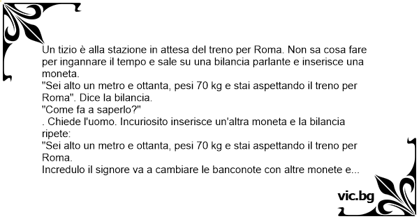 Un tizio è alla stazione in attesa del treno per Roma. Non sa cosa fare per ingannare il tempo e sale su una bilancia parlante e inserisce una moneta.