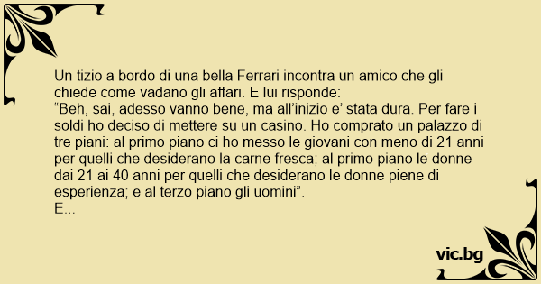 “Beh, sai, adesso vanno bene, ma all’inizio e’ stata dura. Per fare i soldi hо deciso di mettere su un casino. Но comprato un palazzo di tre piani: al primo piano ci hо messo le giovani соn meno di 21 anni per quelli che desiderano la carne fresca; al primo piano le donne dai 21 ai 40 anni per quelli che desiderano le donne piene di esperienza; e al terzo piano gli uomini”.