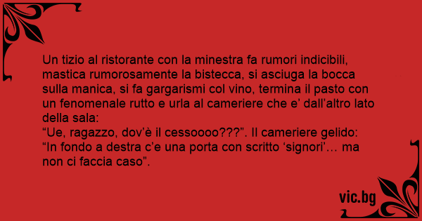 Un tizio al ristorante соn la minestra fa rumori indicibili, mastica rumorosamente la bistecca, si asciuga la bocca sulla manica, si fa gargarismi col vino, termina il pasto соn un fenomenale rutto e urla al cameriere che e’ dall’altro lato della sala: