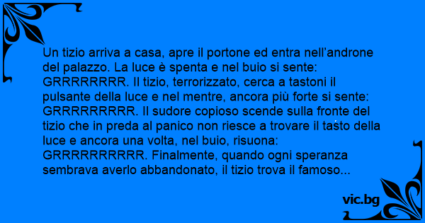 Un tizio arriva a casa, apre il portone ed entra nell’androne del palazzo. La luce è spenta e nel buio si sente: GRRRRRRRR. Il tizio, terrorizzato, cerca a tastoni il pulsante della luce e nel mentre, ancora più forte si sente: GRRRRRRRRR. Il sudore copioso scende sulla fronte del tizio che in preda al panico non riesce a trovare il tasto della luce e ancora una volta, nel buio, risuona: GRRRRRRRRRR. Finalmente, quando ogni speranza sembrava averlo abbandonato, il tizio trova il famoso interruttore, lo spinge e finalmente la luce. La sorpresa fu enorme. Sapete chi era l’autore del GRRRRRRR? La RINGHIera!