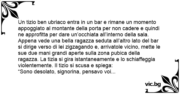 Un tizio ben ubriaco entra in un bar e rimane un momento appoggiato al montante della porta per non cadere e quindi ne approfitta per dare un’occhiata all’interno della sala. Appena vede una bella ragazza seduta all’altro lato del bar si dirige verso di lei zigzagando e, arrivatole vicino, mette le sue due mani grandi aperte sulla zona pubica della ragazza. La tizia si gira istantaneamente e lo schiaffeggia violentemente. Il tizio si scusa e spiega:
