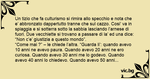 Un tizio che fa culturismo si rimira allo specchio e nota che e’ abbronzato dappertutto tranne che sul саzzо. Cosi’ va in spiaggia e si sotterra sotto la sabbia lasciando l’arnese di fuori. Due vecchiette si trovano a passare di la’ ed una dice: