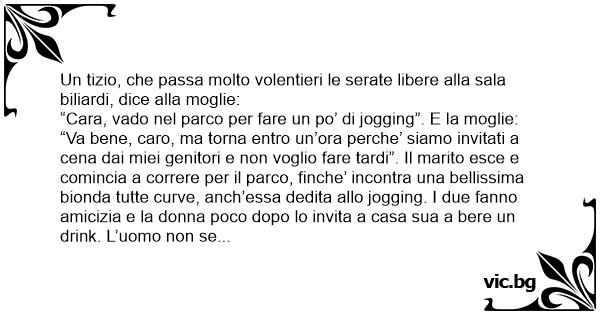 “Va bene, caro, ma torna entro un’ora perche’ siamo invitati a cena dai miei genitori e non voglio fare tardi”. Il marito esce e comincia a correre per il parco, finche’ incontra una bellissima bionda tutte curve, anch’essa dedita allo jogging. I due fanno amicizia e la donna poco dopo lo invita a casa sua a bere un drink. L’uomo non se lo fa ripetere due volte. Appena in casa la bionda dice: