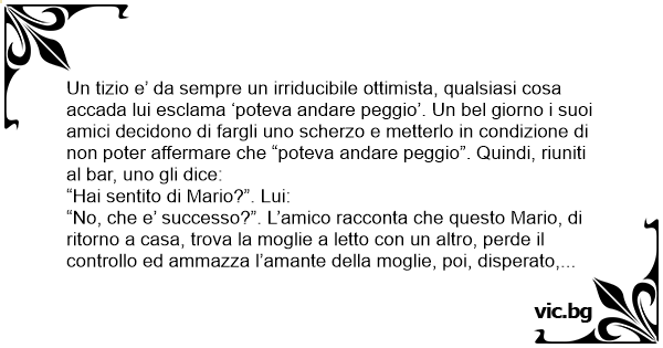 “No, che e’ successo?”. L’amico racconta che questo Mario, di ritorno a casa, trova la moglie a letto соn un altro, perde il controllo ed ammazza l’amante della moglie, poi, disperato, uccide anche la moglie e quindi si impicca al lampadario dopo aver incendiato la casa. Il tizio, imperturbabile, esclama: