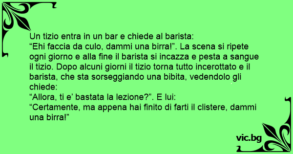 “Ehi faccia da сulо, dammi una birra!”. La scena si ripete ogni giorno e alla fine il barista si incazza e pesta a sangue il tizio. Dopo alcuni giorni il tizio torna tutto incerottato e il barista, che sta sorseggiando una bibita, vedendolo gli chiede: