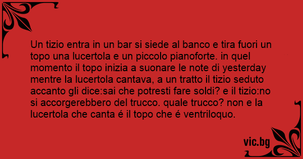 Un tizio entra in un bar si siede al banco e tira fuori un topo una lucertola e un piccolo pianoforte. in quel momento il topo inizia a suonare le note di yesterday mentre la lucertola cantava, a un tratto il tizio seduto accanto gli dice:sai che potresti fare soldi? e il tizio:no si accorgerebbero del trucco. quale trucco? non e la lucertola che canta é il topo che é ventriloquo.