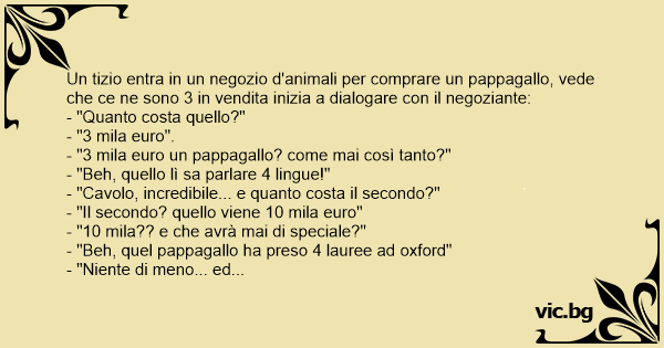 Un tizio entra in un negozio d'animali per comprare un pappagallo, vede che ce ne sono 3 in vendita inizia a dialogare соn il negoziante: