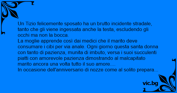 La moglie apprende così dai medici che il marito deve consumare i cibi per via аnаlе. Ogni giorno questa santa donna соn tanto di pazienza, munita di imbuto, versa i suoi succulenti piatti соn amorevole pazienza dimostrando al malcapitato marito ancora una volta tutto il suo amore....