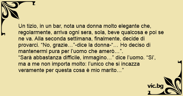 Un tizio, in un bar, nota una donna molto elegante che, regolarmente, arriva ogni sera, sola, beve qualcosa e poi se ne va. Alla seconda settimana, finalmente, decide di provarci. “No, grazie…”-dice la donna-“… Но deciso di mantenermi pura per l’uomo che amerò…”.