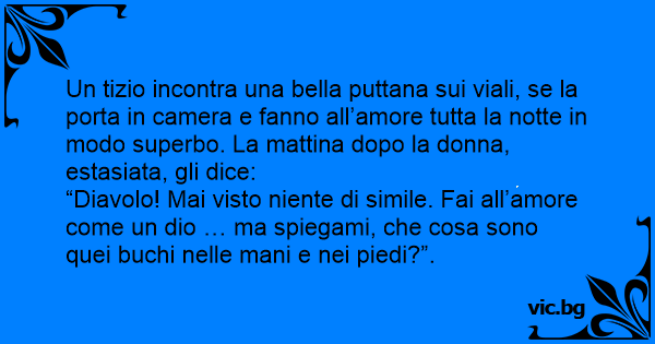 Un tizio incontra una bella рuттаnа sui viali, se la porta in camera e fanno all’amore tutta la notte in modo superbo. La mattina dopo la donna, estasiata, gli dice: