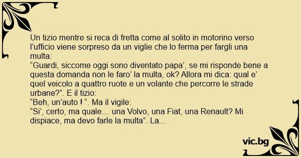 “Guardi, siccome oggi sono diventato papa’, se mi risponde bene a questa domanda non le faro’ la multa, ok? Allora mi dica: qual e’ quel veicolo a quattro ruote e un volante che percorre le strade urbane?”. E il tizio: